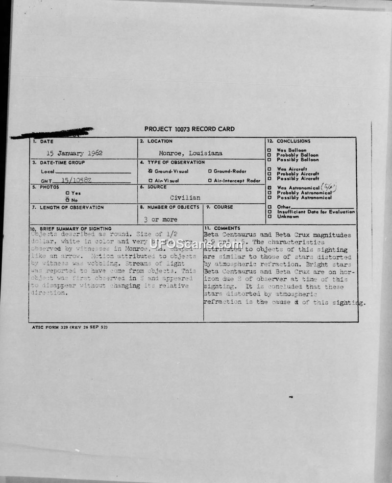 Project 10073 Record Card and Air Intelligence Information Report — Monroe, Louisiana, 15 January 1962