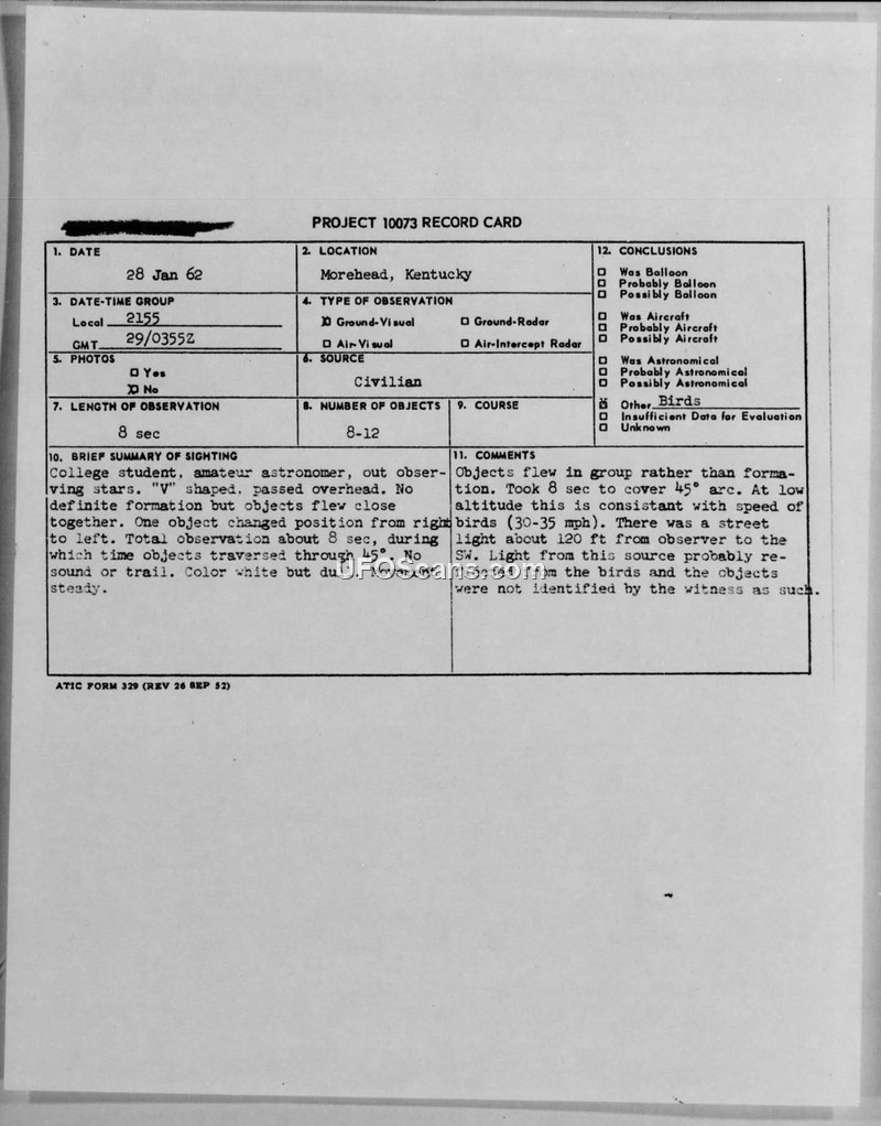A 1962 sighting of 8-12 'V' shaped objects in Morehead, Kentucky, was investigated by Project Blue Book. The official conclusion attributed the sighting to birds reflecting light from a nearby street lamp.