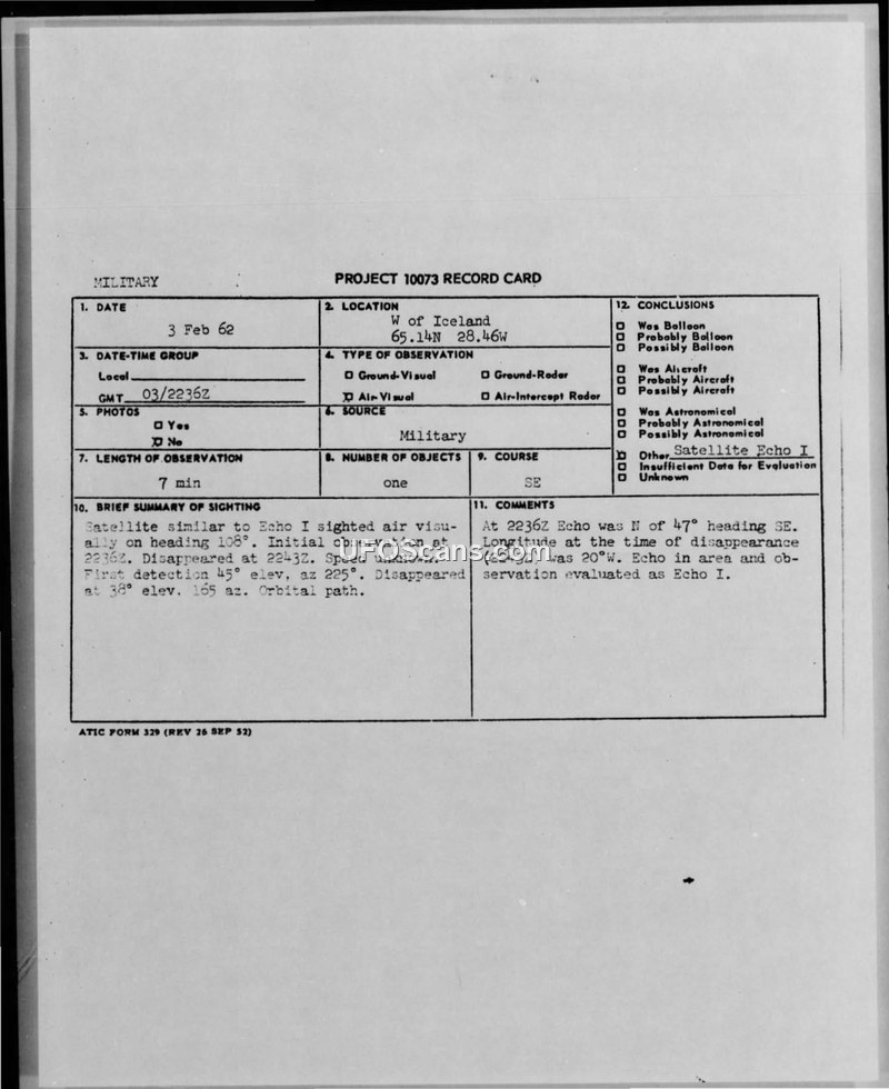 A military aircraft crew observed an unidentified object west of Iceland on February 3, 1962. The object was officially identified as the Echo I satellite.