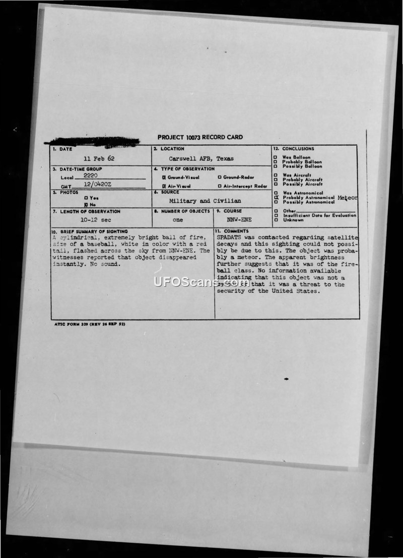 On February 11, 1962, at approximately 2220 local time, personnel at the Carswell Air Force Base control tower observed an unidentified aerial phenomenon. The witnesses, including T/Sgt Billy E. Hornaday and A/1C Donald E. Norris, described the object as a cylindrical, white ball of fire, roughly the size of a baseball, featuring a red tail that extended approximately six times the length of the object. The object traveled from NNW to ENE across the sky, remaining visible for 10 to 12 seconds before disappearing instantly without making any sound. A civilian witness, identified as a 41-year-old New York Life Insurance representative, also reported the sighting. The incident was reported to various military commands, including the Air Defense Command and the Air Technical Intelligence Center (ATIC). Additional reports indicated that the object was seen by personnel at Amon Carter Airport, and American Flight 61A, flying between Tulsa and Amarillo at 31,000 feet, reported the object passing overhead eastward. The Air Force conducted an investigation, which included contacting SPADATS (Space Detection and Tracking System) to determine if the sighting could be attributed to satellite decay. A memo dated February 15, 1962, from Sgt Mooly confirmed that there had been no satellite decay since January 31. The official conclusion reached by the Air Force was that the object was likely a meteor, specifically of the fireball class. The report explicitly stated that there was no information to suggest the object posed a threat to the security of the United States or that it was anything other than a natural phenomenon.