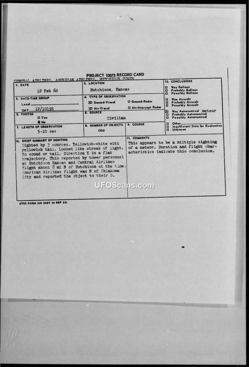 On February 12, 1962, at approximately 0419 Central Time, a sighting of an unidentified aerial object was reported by three distinct sources: personnel at the Hutchinson, Kansas tower, an American Airlines flight (Flight 61), and a Central Airlines flight (Flight 59). The object was described as a yellowish-white streak of light with a yellowish-white tail. Witnesses reported that the object made no sound and traveled in a flat trajectory from west to east. The estimated speed was between 800 and 1000 miles per hour, and it appeared to be 3000 to 4000 feet above the horizon. The duration of the sighting was between 5 and 10 seconds before the object faded out. At the time of the sighting, the Central Airlines plane was located 8 miles north of Hutchinson, while the American Airlines flight was 30 miles north of Oklahoma City at an altitude of 31,000 feet, reporting the object to their south and above their position. The incident was formally documented on a Project 10073 record card and reported via a staff message from the 328th Fighter Wing at Richard Gebaur AFB to the Air Technical Intelligence Center at Wright-Patterson AFB. The official conclusion reached by the Air Force was that the object was an astronomical meteor, citing the duration and flight characteristics as the primary evidence for this determination.