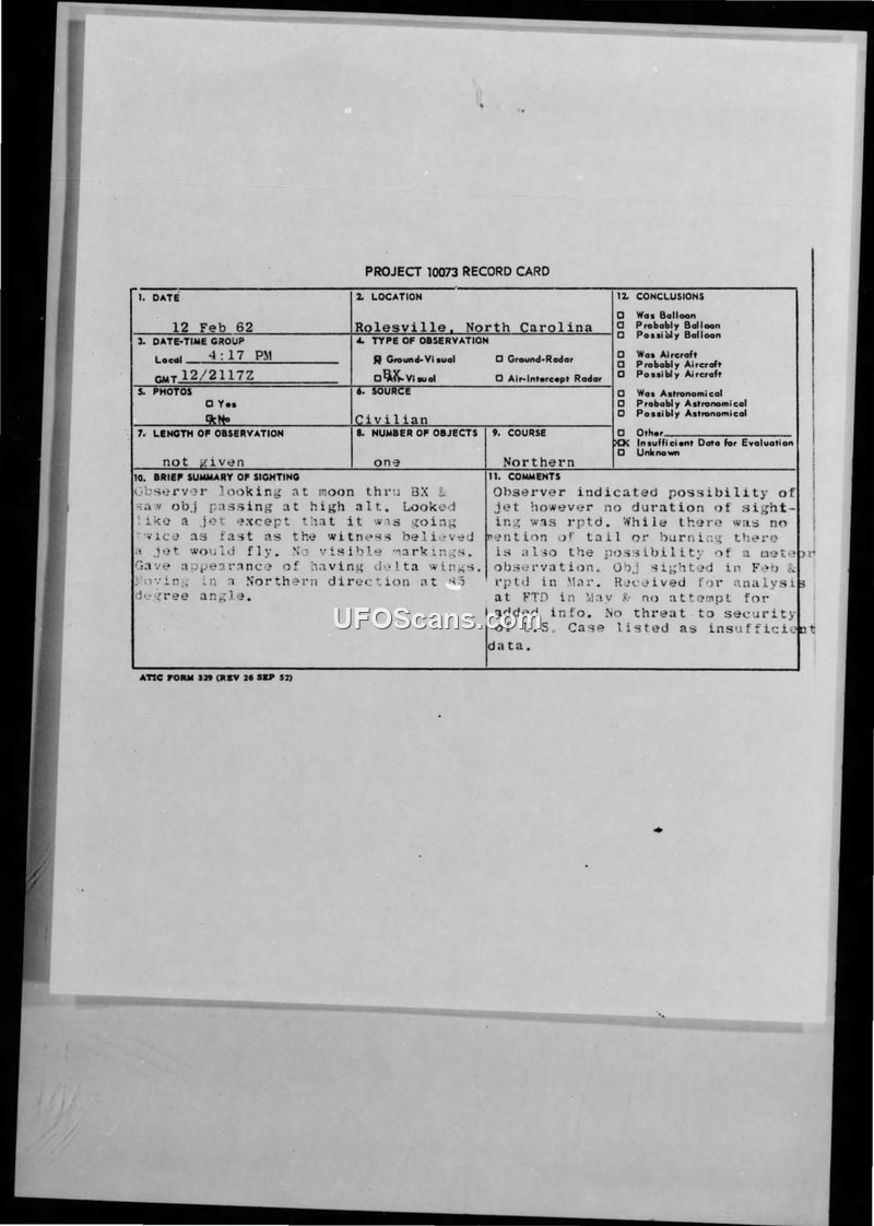 Project 10073 Record Card — Rolesville, North Carolina, 12 February 1962