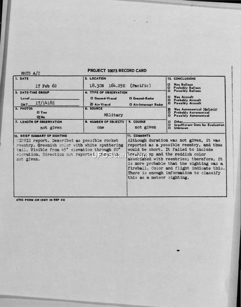 On February 17, 1962, at 1418Z, a Military Air Transport Service (MATS) aircraft reported a sighting in the Pacific region at coordinates 18.30N 164.25E. The report was filed under the CIRVIS (Communication Instructions for Reporting Vital Intelligence Sightings) system. The witness described observing an object with a greenish color and a white sputtering tail. The object was visible from an elevation of 45 degrees down to 20 degrees. The direction of travel was not reported, and the duration of the sighting was not provided. The incident was documented on a Project 10073 Record Card and disseminated via multiple military staff messages to various commands, including CINCPAC, CINCNORAD, and the Office of the Chief of Staff of the Air Force. The Air Technical Intelligence Center (ATIC) evaluated the report. While the initial observer suspected a rocket reentry, ATIC analysts noted that the report lacked the characteristic breaking up and the reddish color typically associated with reentry events. Consequently, the investigators concluded that the sighting was more likely a fireball or meteor, stating that the color and flight characteristics provided sufficient information to classify the event as a meteor sighting.