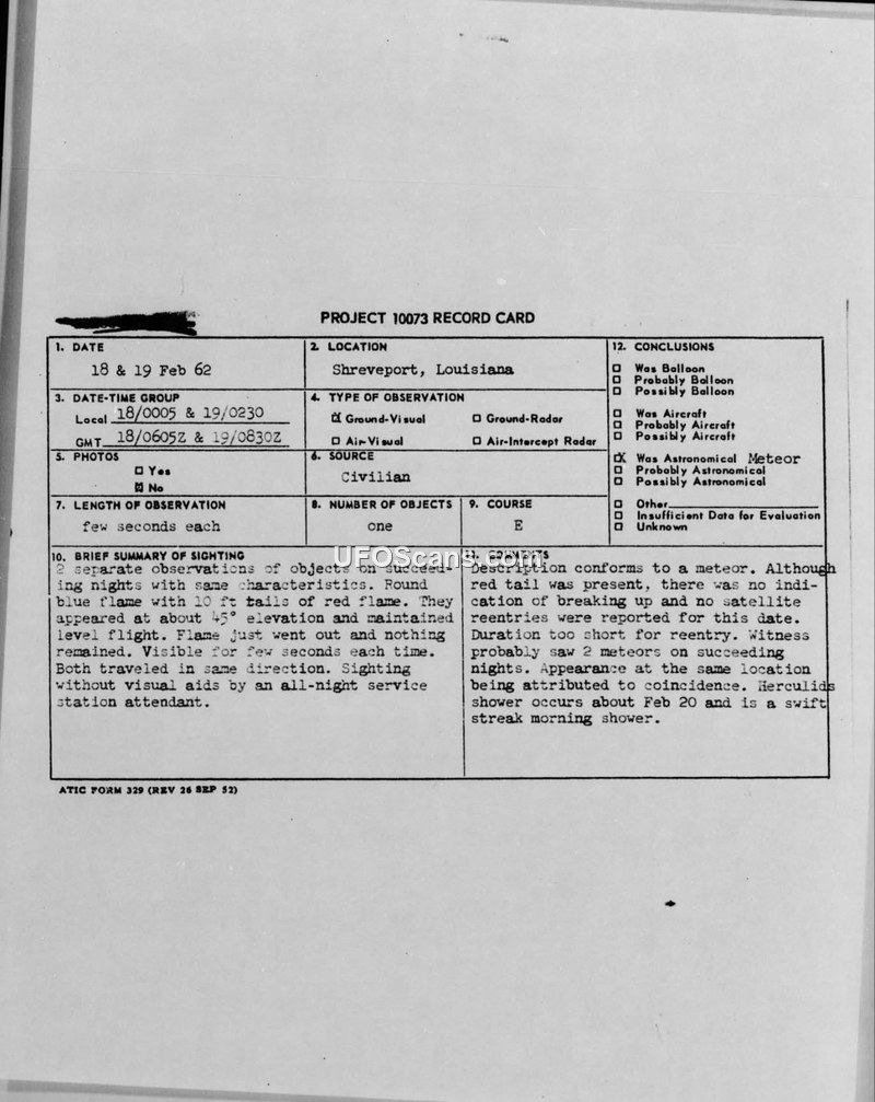This document contains an Air Intelligence Information Report and a Project 10073 Record Card regarding a sighting of an unidentified flying object in Shreveport, Louisiana, on the nights of 18 and 19 February 1962. The witness, an all-night service station attendant, reported observing a round object with a blue flame and a ten-foot red tail on two consecutive nights. The object appeared at approximately 45 degrees elevation and maintained a straight, level flight path at an estimated altitude of 500 feet. The witness noted that the flame would extinguish, leaving nothing behind, and the entire observation lasted only a few seconds each time. Major John R. Aidem of the 4238th Strategic Wing interviewed the witness in person on 19 February 1962. The official conclusion reached by the intelligence officers was that the sightings were consistent with meteors. Despite the presence of a red tail, investigators noted there was no evidence of the object breaking up, and no satellite reentries were recorded for those dates. The report suggests the sightings were coincidental, noting that the Herculids meteor shower occurs around February 20. While the official conclusion categorized the event as a meteor, the investigator's notes in the report acknowledge that the speed and description of the object did not seem to fit any known object.