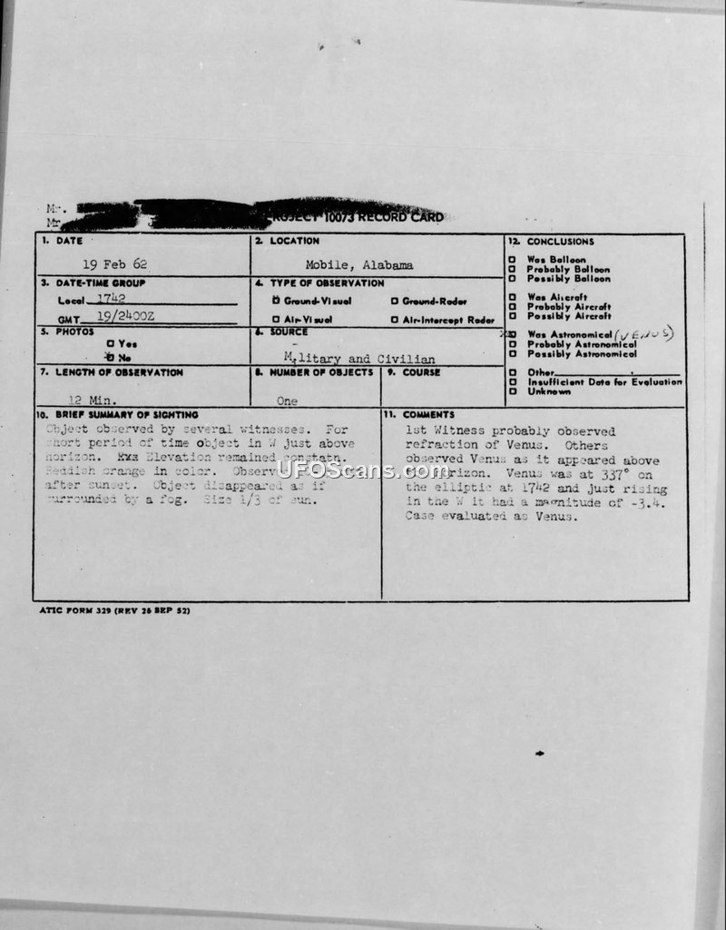 A UFO sighting in Mobile, Alabama, on 19 February 1962 was investigated by the Air Force and officially attributed to the planet Venus.
