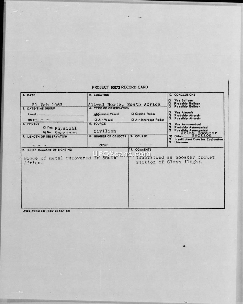 This document collection consists of a Project 10073 record card and a Department of State telegram detailing the recovery and formal presentation of a space debris fragment in South Africa. On February 21, 1962, a piece of metal, approximately two feet square, was recovered near Aliwal North, Cape Province. The object was subsequently identified as a section of the Atlas rocket booster used to launch Lt. Col. John H. Glenn, Jr. and the Friendship 7 spacecraft into orbit on February 20, 1962. The telegram, dated August 31, 1962, describes a ceremony held in Pretoria where U.S. Ambassador Joseph C. Satterthwaite presented the mounted and inscribed fragment to the South African Minister of Foreign Affairs, Eric Louw. The inscription on the fragment explicitly states it was presented by the United States of America National Aeronautics and Space Administration. The remaining fragments recovered by South African authorities were returned to the United States for analysis. The record card also includes a brief, separate account of a sighting reported on February 21, 1962, at 1:05 AM near Kimberley, where residents observed three objects travelling horizontally from the south. These objects were described as brilliant, with the center object gaining intensity and emitting a flash before disappearing. This sighting report is distinct from the confirmed recovery of the rocket booster fragment, which was officially categorized as a known space object.