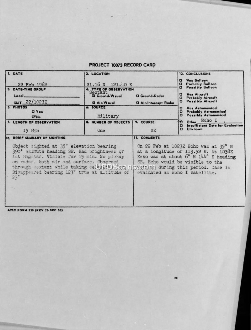 PROJECT 10073 RECORD CARD: Sighting of 22 Feb 1962