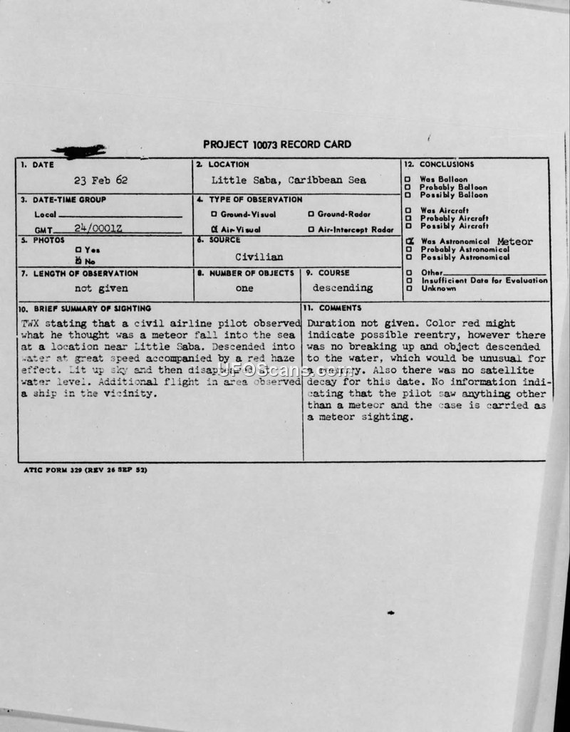 A Caribair pilot reported a red, fast-moving object descending into the Caribbean Sea near Little Saba. The Air Force investigated the incident under Project 10073 and officially classified it as a meteor sighting.