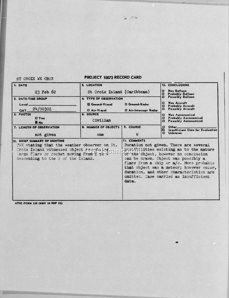 On February 23, 1962, at approximately 0030Z, a weather observer stationed on St. Croix Island in the Caribbean reported an unidentified aerial phenomenon. The observer described the object as resembling a large flare or a rocket. According to the official record card and the associated incoming military message, the object was observed moving from an easterly to a westerly direction and appeared to descend to the south of the island. The report was transmitted via the San Juan Fixed Aero Station to the Commander, Caribbean Sea Frontier (COMCARIBSEAFRON). The military authorities processed the report under Project 10073. Upon review, investigators determined that the duration of the sighting was not provided and that critical details, such as the object's color and specific flight characteristics, were missing. The official assessment suggested that the object could have been a flare launched from a ship or an aircraft, or potentially a meteor. Because of the lack of sufficient data to perform a definitive evaluation, the case was officially closed and categorized as having insufficient data.