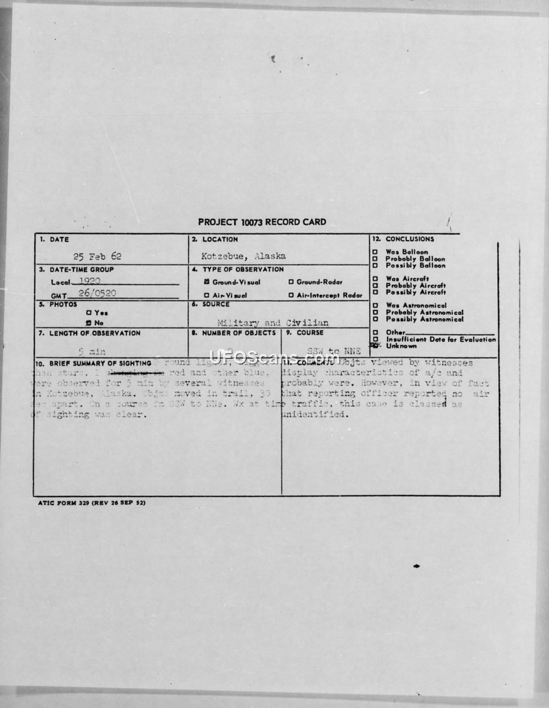 UFO Sighting in Kotzebue, Alaska Area, 26/0520Z Feb 62