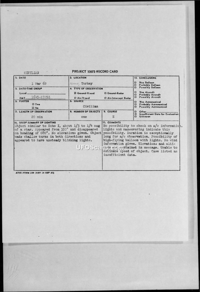 This document consists of a Project 10073 record card and the associated incoming military message regarding an unidentified aerial phenomenon observed over Incirlihb, Turkey, on March 1, 1962. A ground observer reported seeing an object between 1645 and 1705 Zulu time. The witness described the object as having a magnitude of approximately one-third to one-fourth that of a star. It was first observed at a 350-degree magnetic bearing and eventually disappeared on a heading of 080 degrees. The observer noted that the object performed shallow turns in both directions and exhibited unsteady, blinking lights. The report explicitly states that the object's height was unknown. The military message, originating from HQ TUSLOG, was transmitted to various commands, including ADC at Ent AFB, ATIC at Wright-Patterson AFB, and HQS USAF. The ATIC evaluation on the record card notes that there was no possibility to verify aircraft information for the time and location. The investigators remarked that the duration of the sighting—20 minutes—was exceptionally long for an aircraft observation. While the possibility of a high-flying balloon with lights was considered, the lack of wind data, altitude information, and elevation details prevented a definitive identification. Consequently, the case was officially classified as having insufficient data for evaluation.