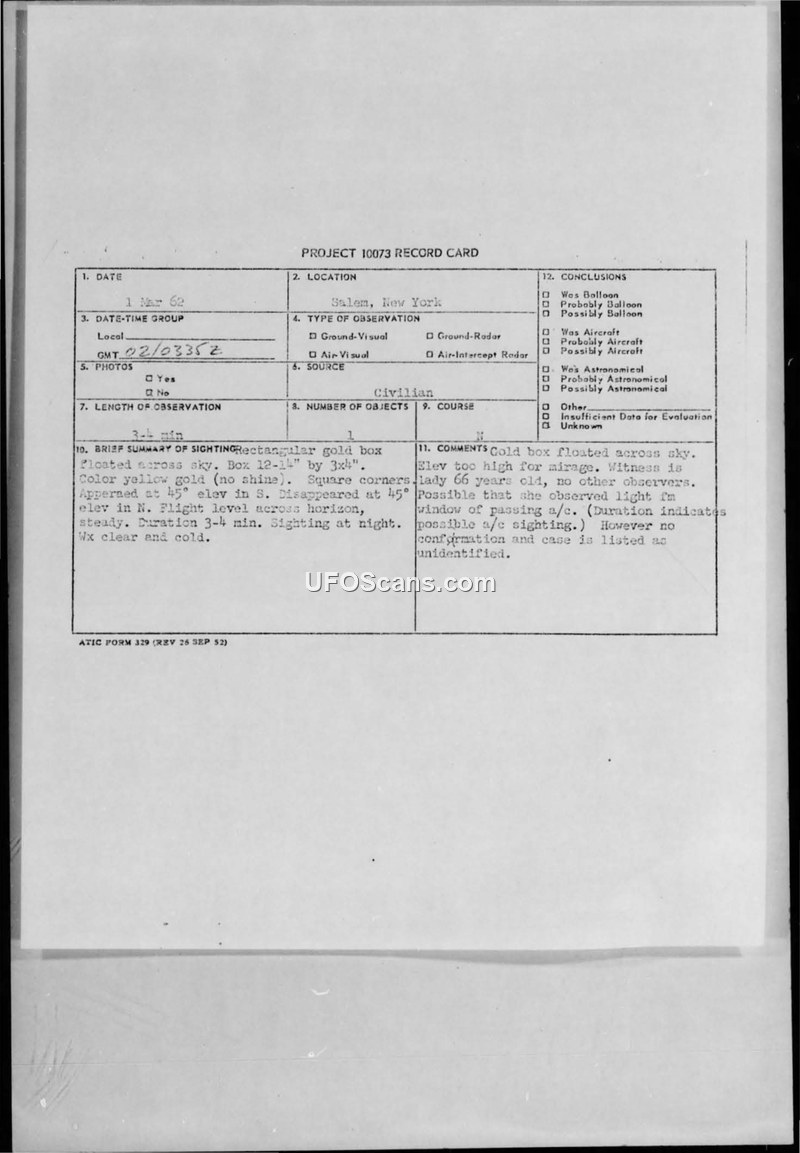 A 66-year-old witness reported a rectangular, yellow-gold object in the sky over Salem, New York, on 2 March 1962. The Air Force investigation concluded the object was unidentified, noting the witness was alert and reliable.