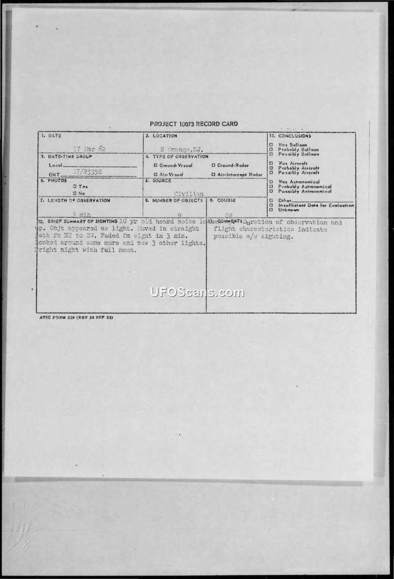 A 10-year-old witness in East Orange, NJ, reported observing four unidentified aerial objects on March 17, 1962. The Air Force investigation noted the characteristics were consistent with a possible aircraft sighting.