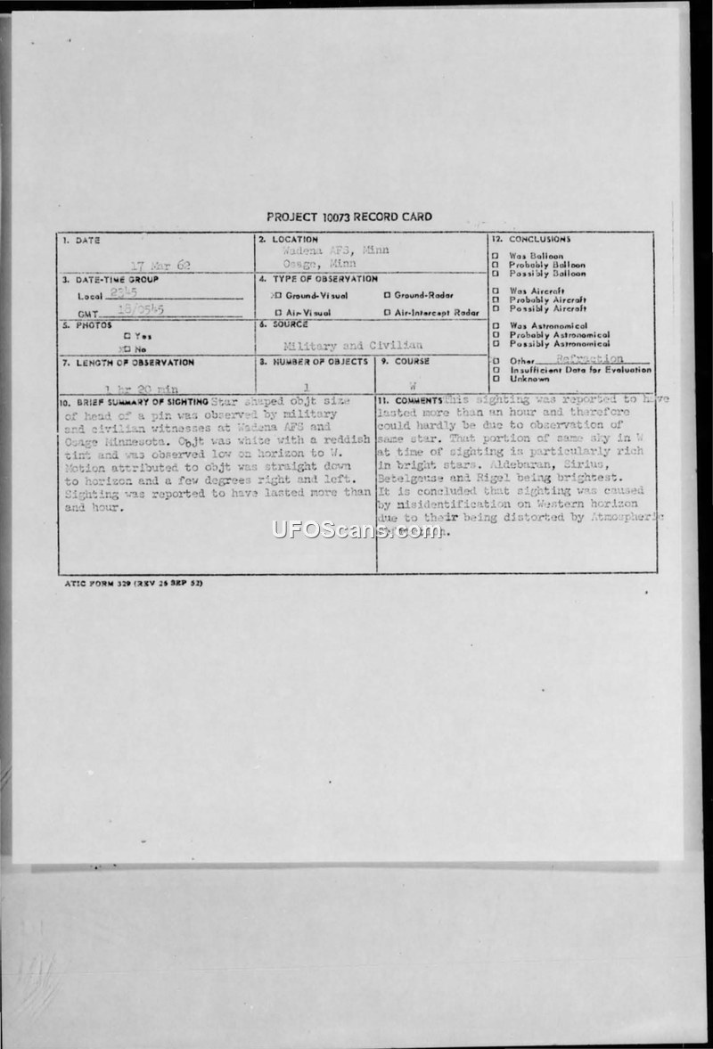A March 1962 sighting of a star-like object by military and civilian witnesses in Minnesota was officially attributed to atmospheric refraction of bright stars.
