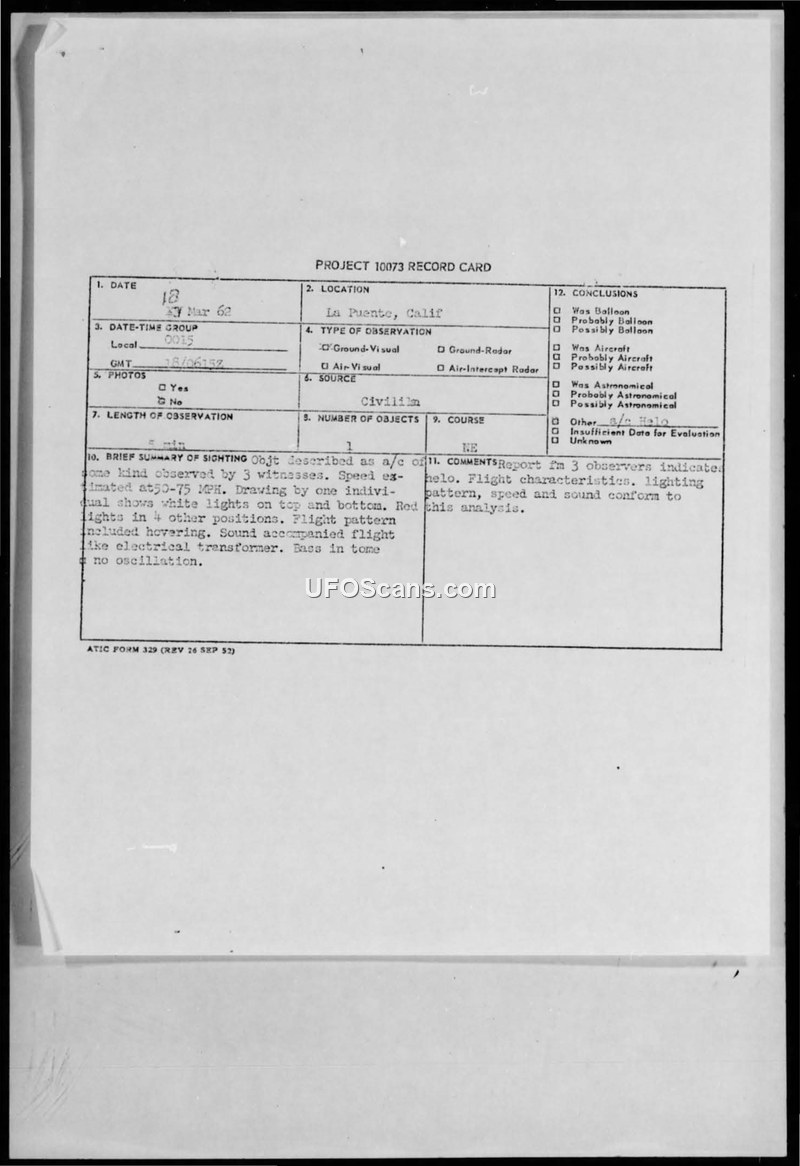 Project 10073 Record Card — La Puente, California, March 17, 1962