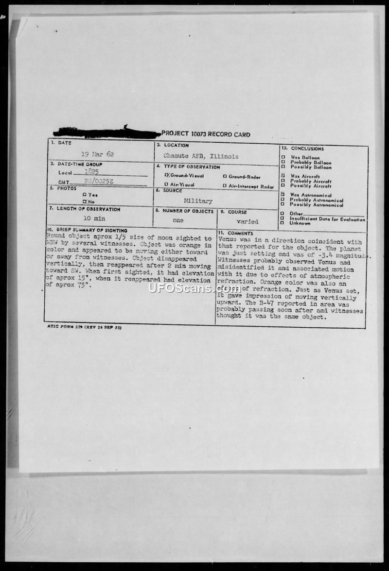 A 1962 sighting of an orange, shape-shifting object at Chanute AFB was officially identified as the planet Venus, potentially confused with a B-47 aircraft in the vicinity. The report was filed by military personnel and evaluated by a former B-47 pilot.
