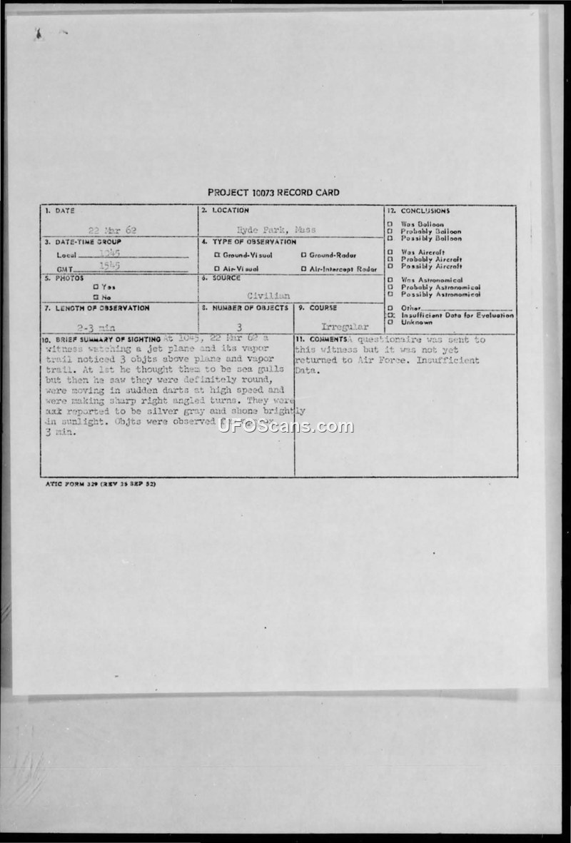 PROJECT 10073 RECORD CARD — Hyde Park, Mass, 22 March 1962