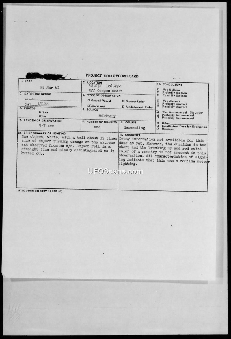 A military flight crew observed a descending, disintegrating object off the Oregon coast on March 25, 1962. The Air Force concluded the event was a routine meteor sighting.