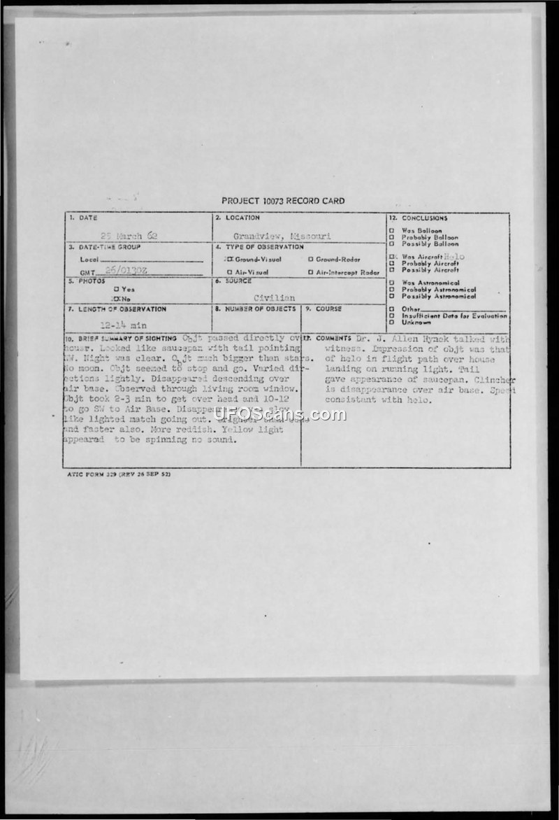 Project 10073 Record Card — Grandview, Missouri, 25 March 1962
