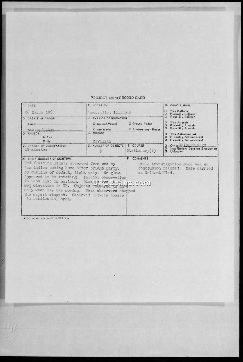 Project 10073 Record Card and Investigation Report — Naperville, Illinois, 26 March 1962