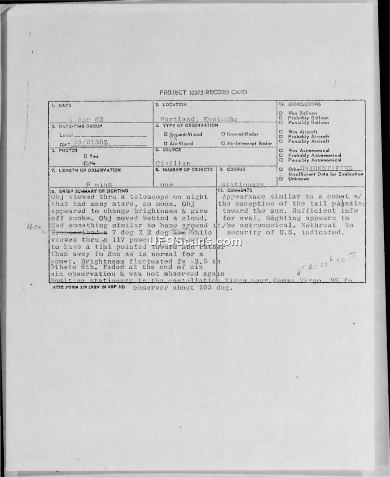 A 15-year-old witness observed a stationary, comet-like object through a telescope in Wurtland, Kentucky, on April 4, 1962. The Air Force concluded the sighting was astronomical in nature.