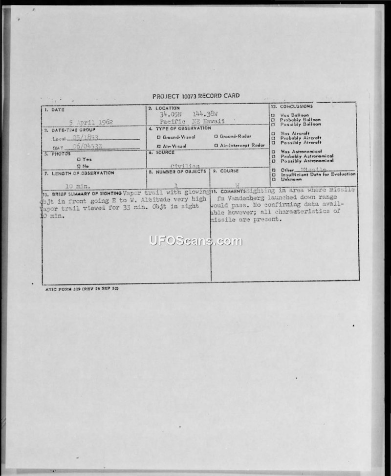 On April 5, 1962, at 05:18 local time, a sighting was reported by the crew of Pan American flight 891, a Boeing 707. The observation occurred in the Pacific region, northeast of Hawaii, at coordinates 34.05N 144.38W. The witnesses observed a vapor trail with a glowing object positioned in front of it. The vapor trail was visible for 33 minutes, while the glowing object itself was in sight for 10 minutes. The object was reported to be at a very high altitude and was traveling from East to West. The report was processed as part of Project 10073. Official comments noted that the sighting occurred in an area where a missile launched from Vandenberg would pass. While the report states that all characteristics of a missile were present, it explicitly notes that no confirming data was available to verify the origin of the object, leading to a conclusion of insufficient data.
