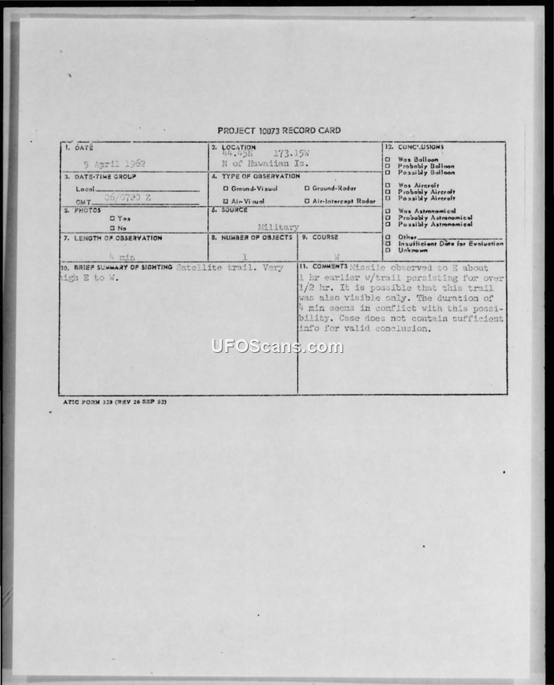 PROJECT 10073 RECORD CARD - Sighting Report 5 April 1962