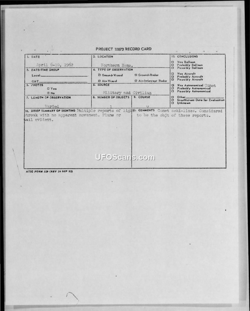 This document collection centers on a series of CIRVIS (Communication Instructions for Reporting Vital Intelligence Sightings) reports filed between April 6 and April 10, 1962, regarding sightings of light streaks in the sky. Multiple military and civilian observers, including a pilot with 5,000 hours of flight time, reported seeing a comet-like object with a distinct tail. The reports originated from various locations, including Hawaii and over the continental United States. The observers described the object as a light streak with no apparent movement, often resembling a contrail. One witness, a pilot, noted that the object appeared to be a light streak and was visible while flying in a T-33 aircraft. The official conclusion recorded on the Project 10073 record card is that these sightings were attributable to the comet Seki. The file includes technical information sheets completed by witnesses, incoming staff messages from the Department of the Air Force, and supporting documentation from Science News Letter regarding the visibility and behavior of the comet Seki during that period. The reports were systematically processed by the Air Technical Intelligence Center (ATIC) under Project 10073, with copies distributed to various military commands, including NORAD and SAC. The documentation reflects a coordinated effort to identify the source of these widespread reports, ultimately concluding that the sightings were astronomical in nature rather than unidentified aerial phenomena of unknown origin.
