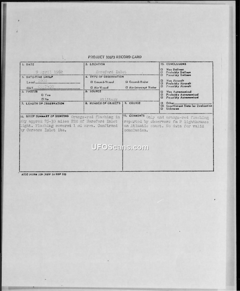 On April 9, 1962, observers at two lighthouses reported an orange-red flashing light in the sky off the Atlantic coast. The Air Force concluded there was insufficient data to identify the object.