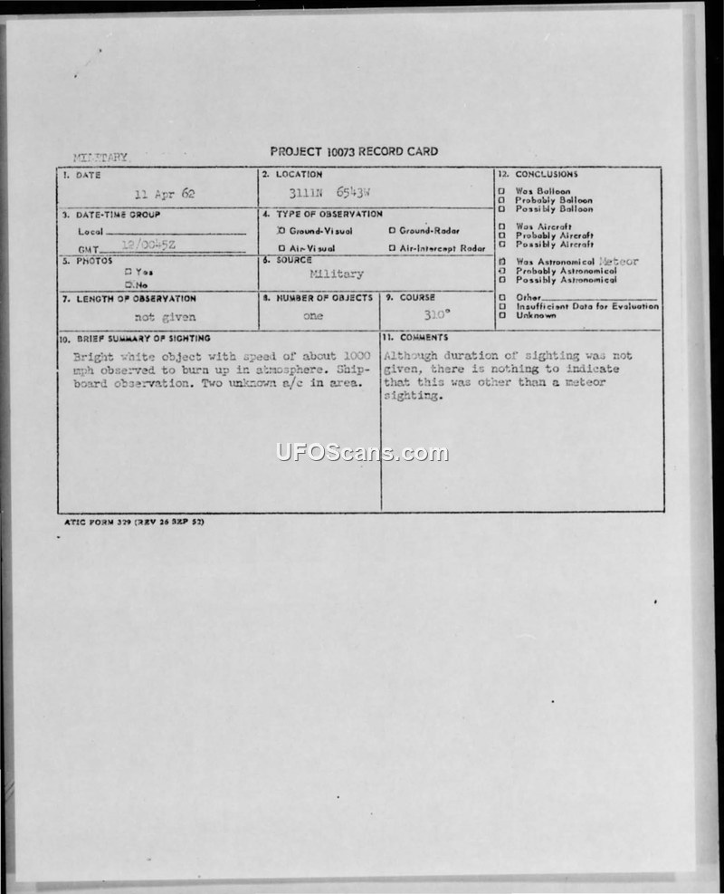 Project 10073 Record Card — Sighting Incident 11 April 1962