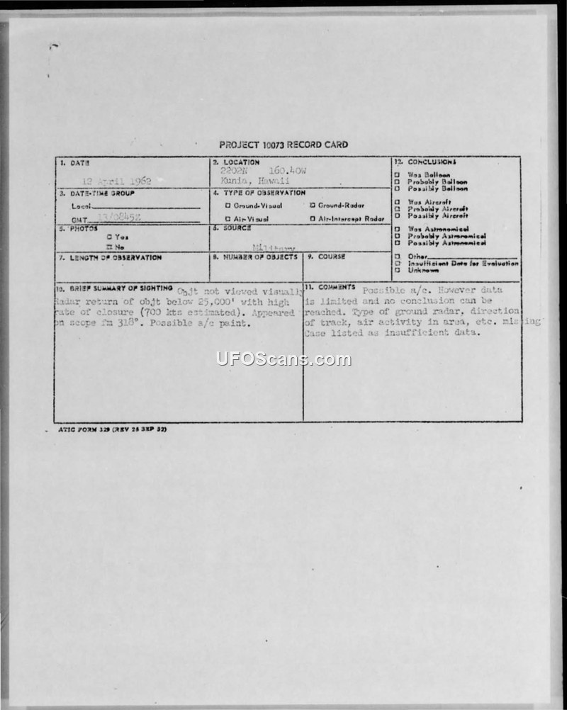 Project 10073 Record Card — Kunia, Hawaii, 13 April 1962