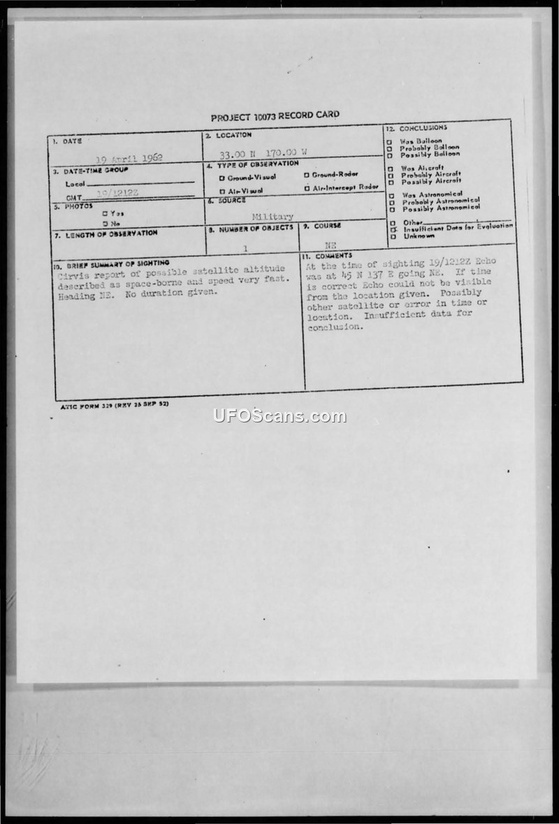PROJECT 10073 RECORD CARD - 19 April 1962