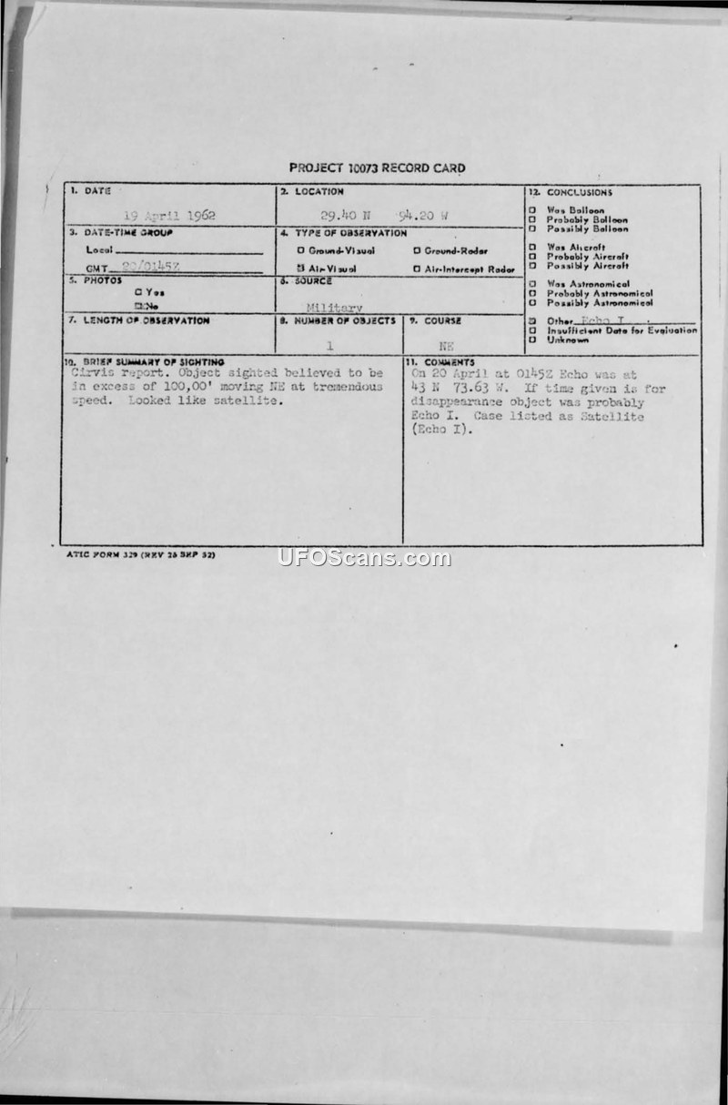 This document consists of a Project 10073 record card and an associated Department of the Air Force staff message regarding a CIRVIS (Communication Instructions for Reporting Vital Intelligence Sightings) report. On 19 April 1962, at 0145Z, a single, bright object was observed at coordinates 29.40 N 94.20 W. The witness reported that the object was moving in a northeasterly direction at a tremendous speed and at an altitude estimated to be in excess of 100,000 feet. The observer noted that the object appeared to be a satellite. The report was transmitted through military channels, including NORAD and various regional commands. Upon evaluation by the Air Technical Intelligence Center (ATIC), the sighting was officially identified as the Echo I satellite. The conclusion was reached by cross-referencing the reported sighting with the known orbital position of the Echo I satellite on 20 April 1962 at 0145Z, which was recorded at 43 N 73.63 W. The investigators noted that if the time provided in the report corresponded to the object's disappearance, the identification of the object as Echo I was highly probable.