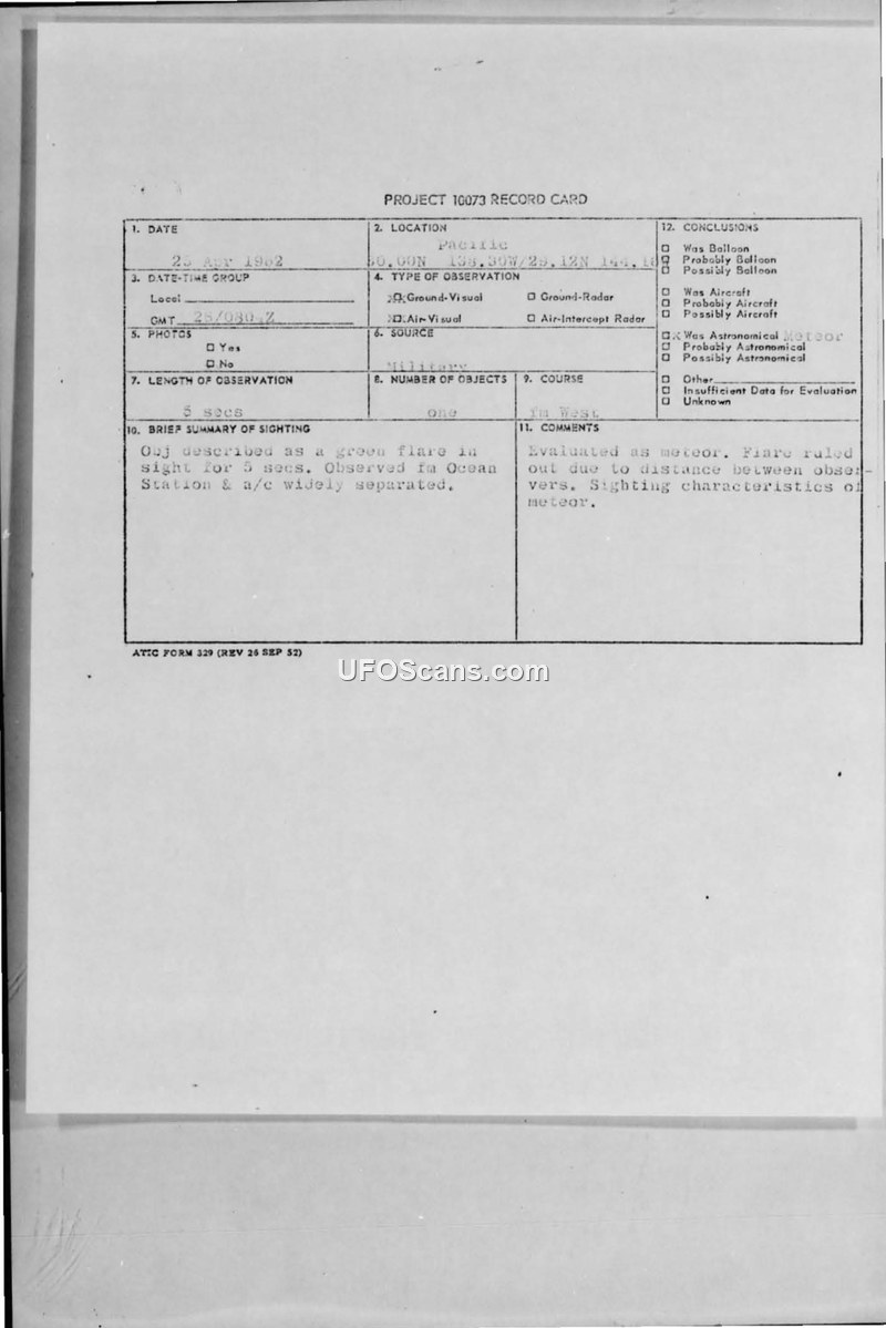 Project 10073 Record Card — Sighting of Green Flare, 25 April 1962