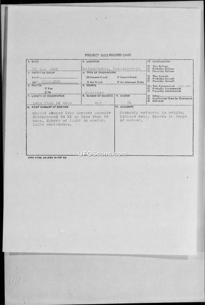 A civilian reported a Mercury capsule-shaped object in Philadelphia on April 27, 1962. ATIC evaluated the sighting and concluded it was likely a meteor.