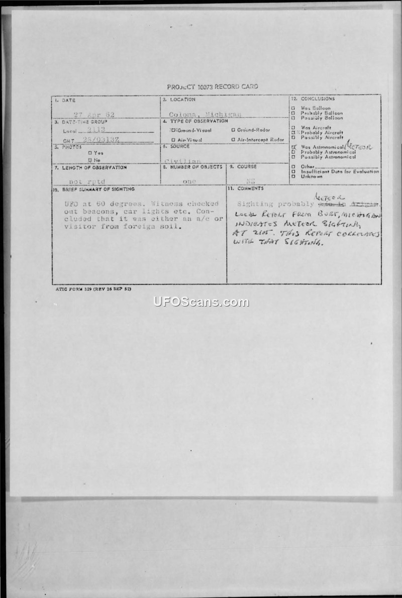Project 10073 Record Card — Coloma, Michigan, April 27, 1962
