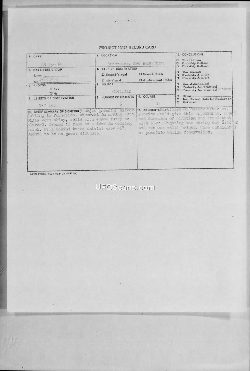 On April 28, 1962, at approximately 6:40 P.M., two witnesses in Rochester, New Hampshire, observed five greenish-silver objects in the sky. The witnesses, who were traveling in a convertible automobile, described the objects as solid, shiny, and having fuzzy or blurred edges. The objects were arranged in a precise square formation with one object at each corner and a fifth object slightly to the left and higher than the top-left corner. The witnesses reported that the objects appeared to be moving from South to North, though their glide appeared to be almost straight down as they disappeared behind trees. The duration of the sighting was estimated at 5 to 7 seconds. The witnesses noted that the objects glowed like a fire from a welding torch and made no sound. The sky was clear and the weather was dry at the time of the incident. The witnesses, who described themselves as reasonably intelligent and not prone to fantasies, reported the incident to the U.S. Air Force. The Air Force requested that the witnesses complete formal questionnaires, which were submitted in May 1962. The official conclusion reached by the Air Force was that the sighting was likely a bolide (meteor) observation, noting that the speed, duration, and appearance were consistent with such an event, especially given that the sighting occurred during daylight hours while the sun was still bright.