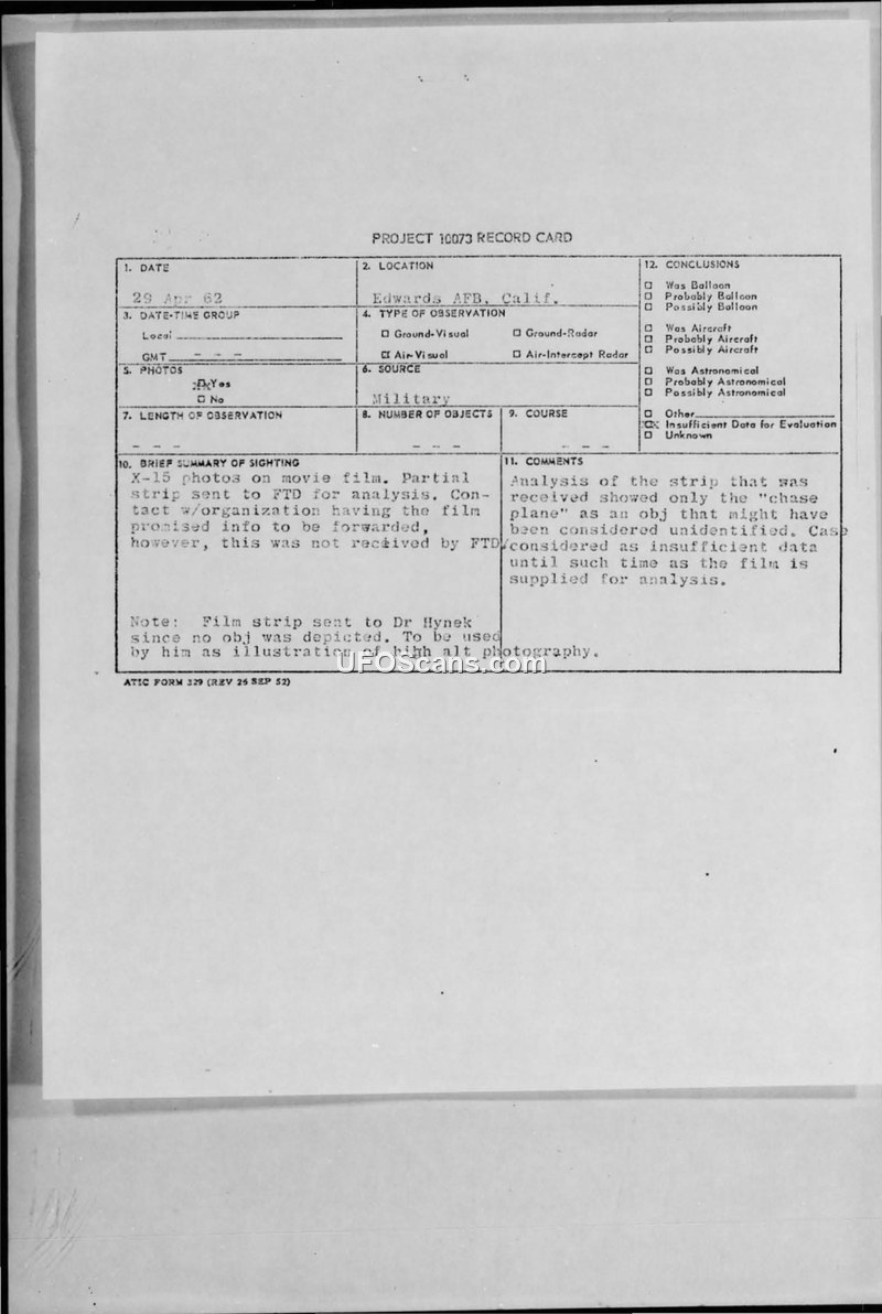 X-15 pilot Joe Walker reported unidentified objects during a high-altitude flight in April 1962. Official analysis concluded the data was insufficient and likely represented ice flakes or the chase plane.