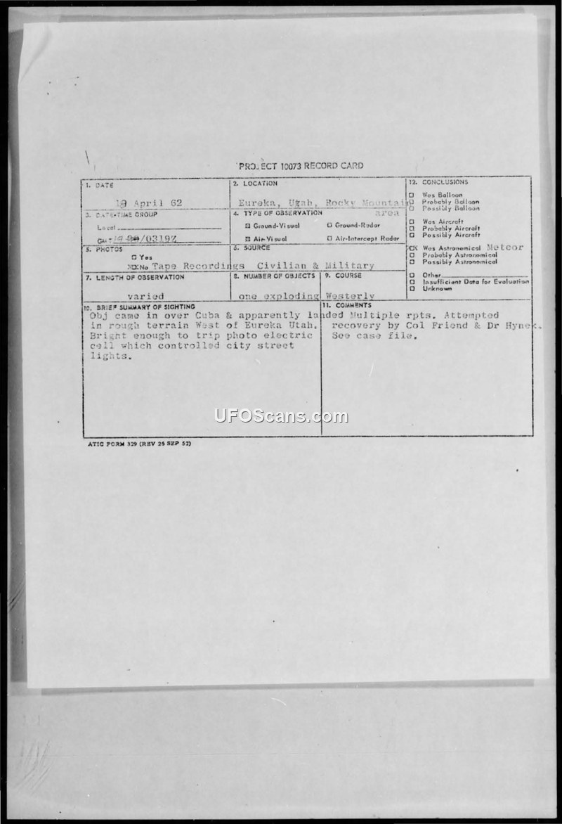 This document compiles reports and investigations regarding a high-profile fireball sighting that occurred over Utah and surrounding states on the night of 18-19 April 1962. The event was widely observed, with reports coming from as far as Idaho, Montana, Oregon, New Mexico, Wyoming, Arizona, Nevada, Kansas, and Utah. Witnesses described a brilliant, rapidly moving object that illuminated the night sky with the intensity of daylight. In Eureka, Utah, the light was so intense that it triggered photo-electric street lighting systems. Multiple witnesses reported hearing a series of 20 to 30 sharp, explosive sounds following the object's passage, which some compared to anti-aircraft fire. Captain Herman G. Shields, a reserve Air Force pilot flying a C-119 aircraft, provided a detailed account of the object, describing it as a slender, cigarette-shaped object with a bright white and yellow-blue flame. He observed it while turning his aircraft, noting that it appeared to travel from the southwest to the northeast. Other witnesses, including sheep herders in Jericho and residents in Silver City, provided corroborating descriptions of the object's appearance and the subsequent explosions. The Air Force Defense Command and the Foreign Technology Division (FTD) conducted a thorough investigation, led by Lt. Col. Robert J. Friend and Dr. J. Allen Hynek. Despite the unique nature of the event and the reports of explosions, the official conclusion reached by the investigators was that the object was a bolide—a large, exploding meteor. The investigation noted that while the object was tracked by radar and observed by multiple parties, no physical evidence was recovered, and the search in the Wasatch National Forest was abandoned due to the inaccessible nature of the terrain. The report emphasizes that the object was not an aircraft or a missile, and that the 'table cloth' or 'cigarette' descriptions were consistent with the visual phenomena of a disintegrating meteor.