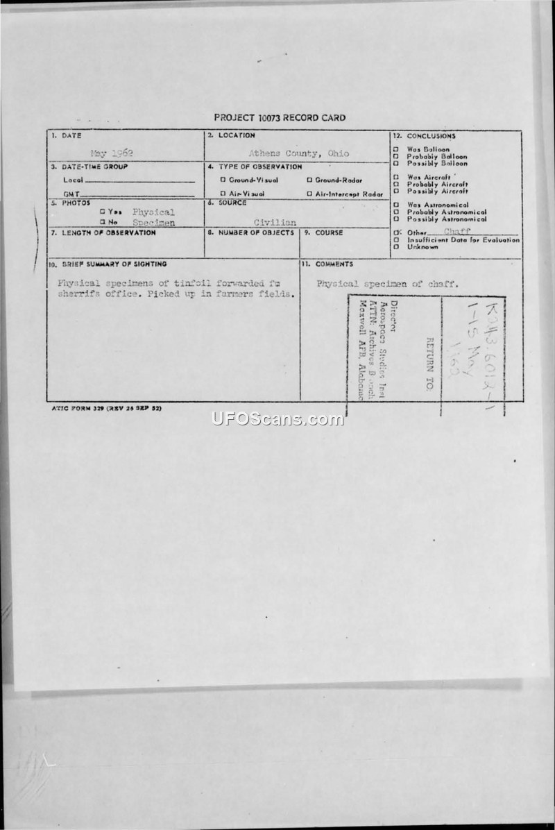 In May 1962, the Sheriff's Office of Athens County, Ohio, reported the discovery of thin strips of aluminum found in local farmers' fields. The material, described as being pink on one side and aluminum-colored on the other, measured approximately 4 3/16 inches in length and 1/16 inch in width. Sheriff Harold E. Shields forwarded physical specimens of this material to the Foreign Technology Division at Wright-Patterson Air Force Base. Following a telephone conversation with Lt. Col. Robert J. Friend, the Sheriff confirmed that the material was identified as chaff. The Sheriff expressed his intent to use this information to satisfy the curiosity of the farmers who had discovered the items in their fields. The incident was documented on a Project 10073 record card, which officially categorized the finding as 'chaff'.