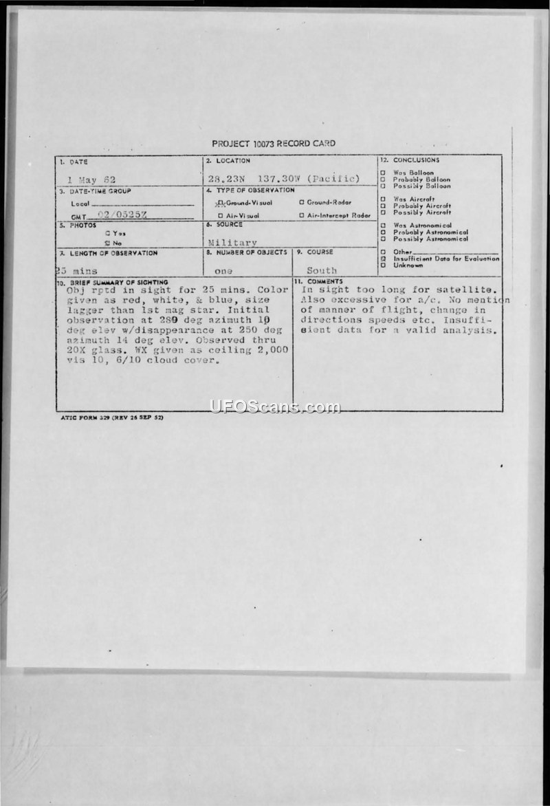 A US Navy officer reported a 25-minute sighting of a multi-colored, unidentified object in the Pacific on May 1, 1962. The report was filed under Project 10073 and concluded that insufficient data existed for a valid analysis.