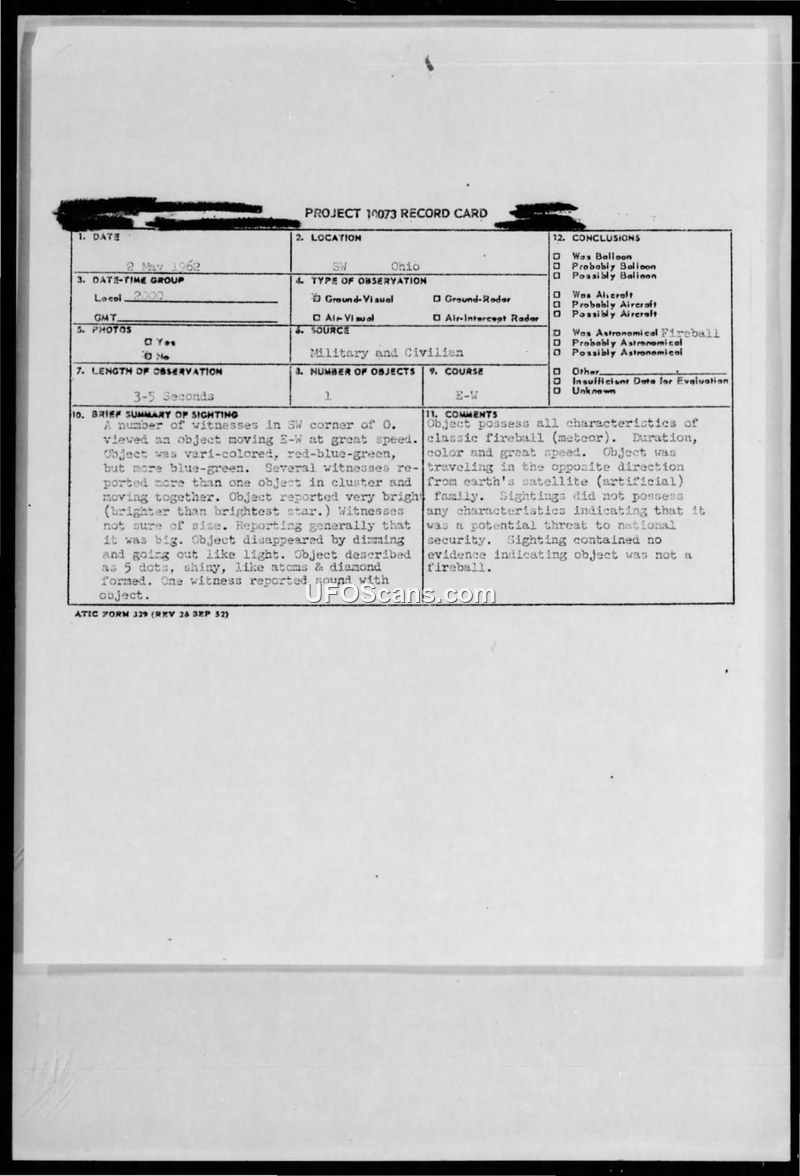 Project 10073 Record Card — Sighting Report, May 2, 1962, Ohio