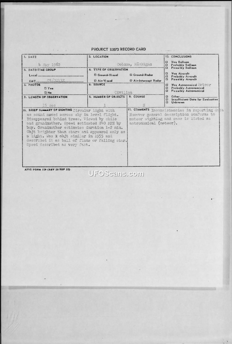 A 15-year-old witness in Coloma, Michigan, reported a 15-second sighting of a bright, circular, silent object moving at 240 MPH on May 4, 1962. The Air Force evaluated the report and concluded the object was a meteor.