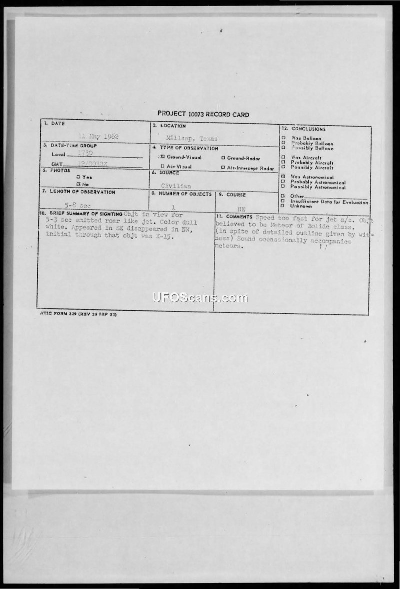 A 1962 sighting report from Millsap, Texas, involving a long, white, jet-like object. The Air Force officially classified the event as a meteor or bolide.
