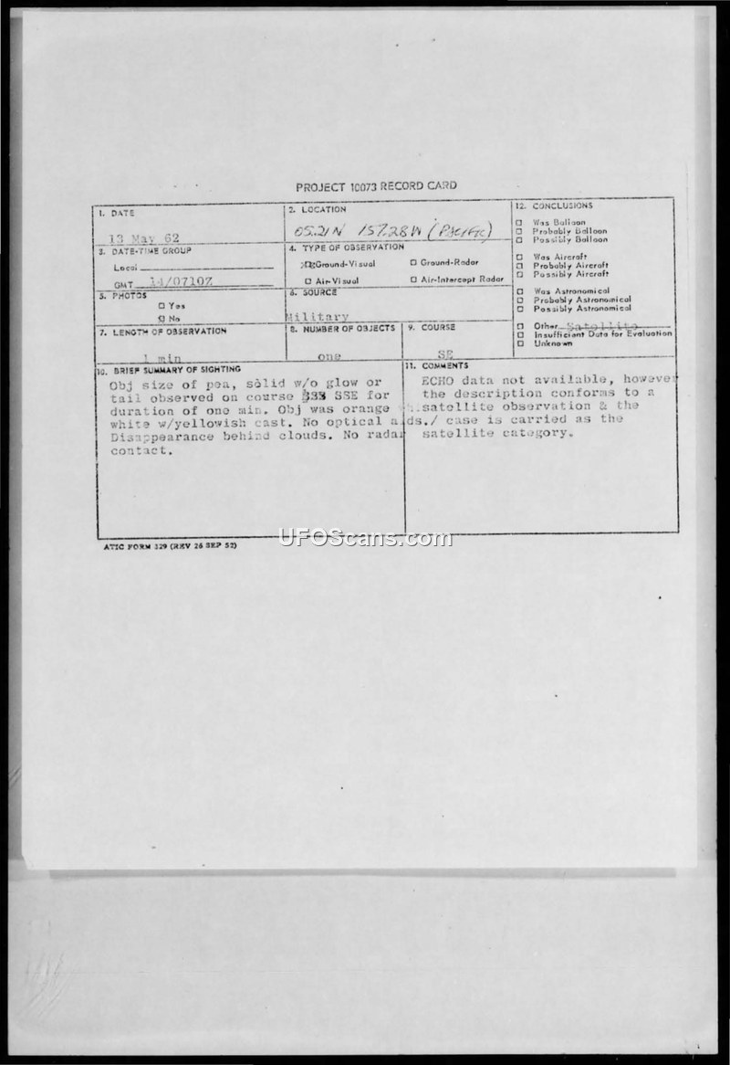 Project 10073 Record Card — Sighting of 13 May 1962