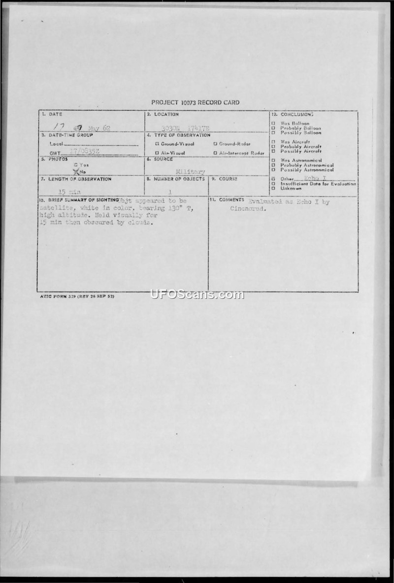 A sighting of an object on May 17, 1962, was reported by the 326 Air Division in Hawaii. The object was later identified by CINCNORAD as the Echo I satellite.