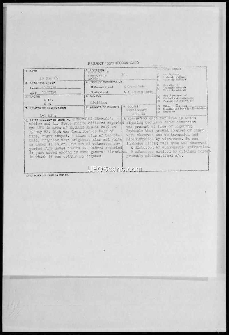 This document compiles reports and follow-up investigations regarding a series of Unidentified Flying Object sightings that occurred in Louisiana on May 20, 1962. The initial reports, which originated from members of the Sheriff's office and State Police, described a bright, cigar-shaped or ball-like object moving in a northwesterly direction. Multiple observers, including law enforcement personnel, provided varying descriptions of the object's size, shape, and color. One observer, initially reporting a sighting, later retracted his statement, attributing his observation to the moon seen through trees and the excitement generated by police radio broadcasts. The Air Force investigation, led by Captain Paul G. Witherew of the 401st Tactical Fighter Wing, analyzed these reports and concluded that the sightings were likely the result of misidentified aircraft or atmospheric phenomena. Specifically, investigators noted an unusual haze in the atmosphere that could distort the size of lights, and suggested that a jet aircraft with its afterburner engaged might account for some of the observations. The document includes detailed location data for the witnesses and meteorological data, including radiosonde observations, to support the conclusion that the phenomena were not anomalous.