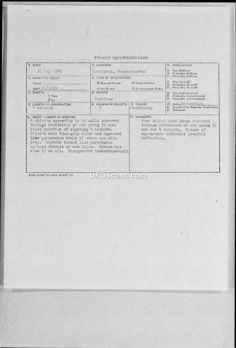 Project 10073 Record Card — Lexington, Massachusetts, 21 May 1962