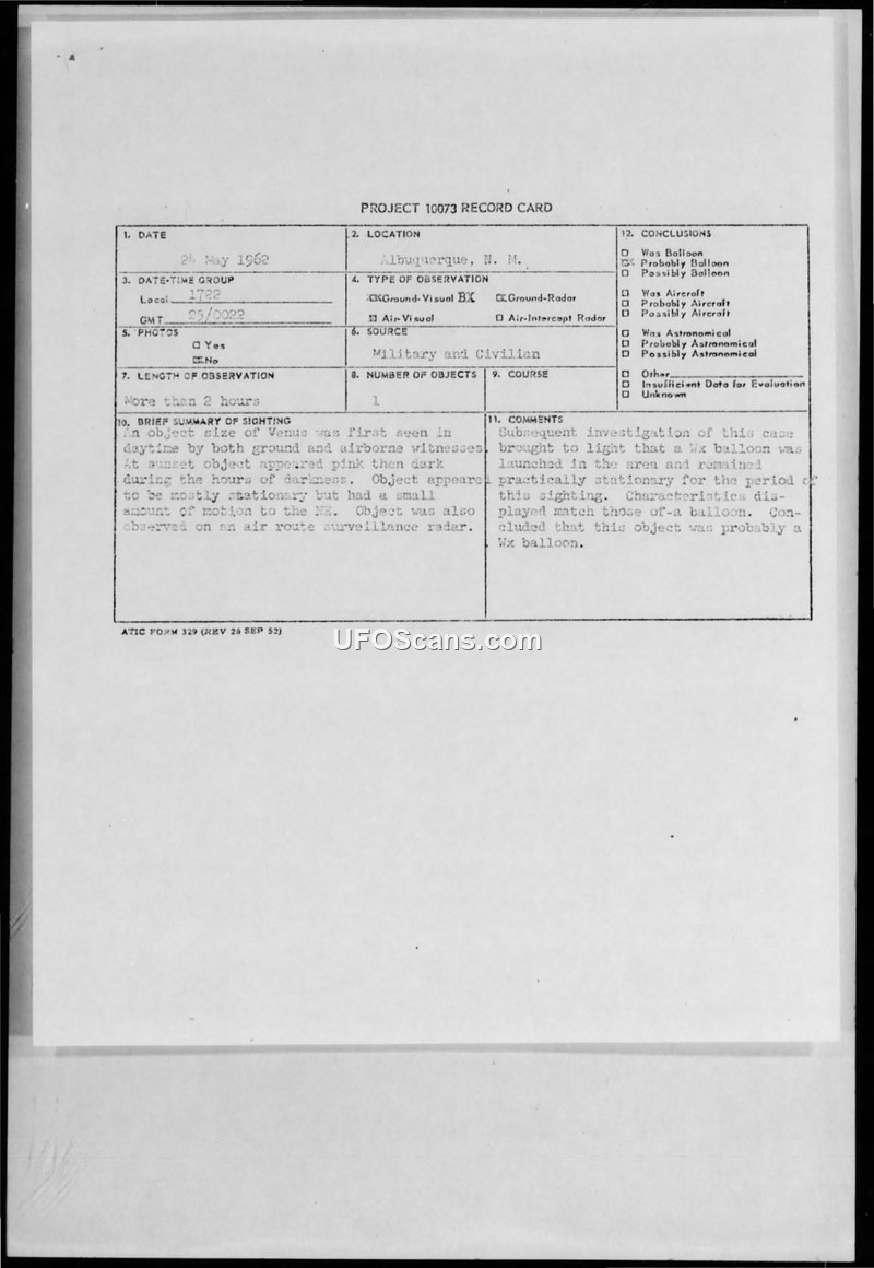 Project 10073 Record Card and Preliminary UFO Report — Albuquerque, New Mexico, 24 May 1962