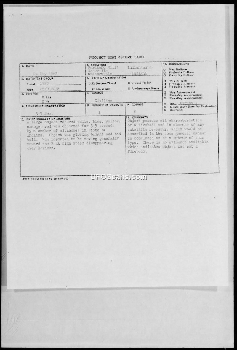 This document is an incoming Air Force message dated May 28, 1962, detailing a UFO sighting that occurred on May 25, 1962, in Indiana. Multiple witnesses, including a quality control supervisor, an engineer, and others, observed a bell-shaped object with an elongated, flaming exhaust tail. The object was described as multi-colored—white, blue, yellow, orange, and red—and appeared like a piece of extremely hot metal. The sighting lasted between 3 and 5 seconds, with the object moving at high speed toward the east. The report includes detailed coordinates and witness locations near Rockville and Portland Mills. While the official conclusion reached by the Air Technical Intelligence Center (ATIC) was that the object was a fireball or meteor, the investigating officers, TSGT Nevin E. Tarr and SSGT John King, expressed a dissenting opinion. Based on the consistency of the witness accounts and the object's flight characteristics, the investigators stated that they believed the object was not a natural phenomenon and could potentially be a self-powered projectile.
